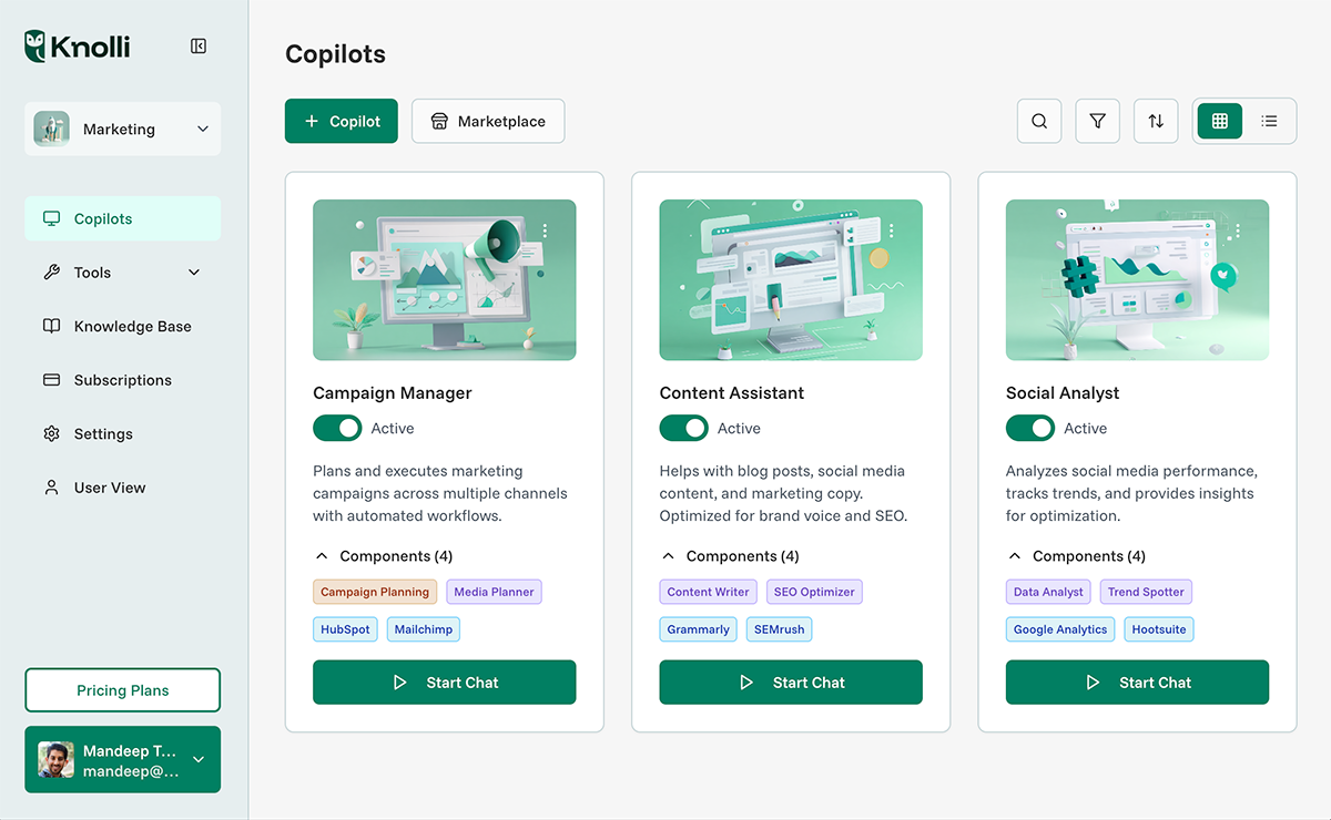 From internal copilots to public-facing AI products, Knolli adapts to your vision and helps you monetize it.