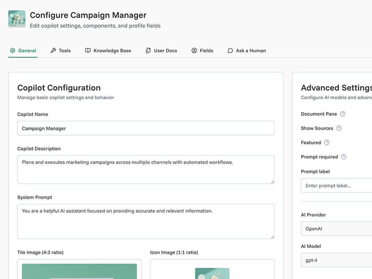 Launch copilots under your own brand with custom domains, logos, and interface styling.
